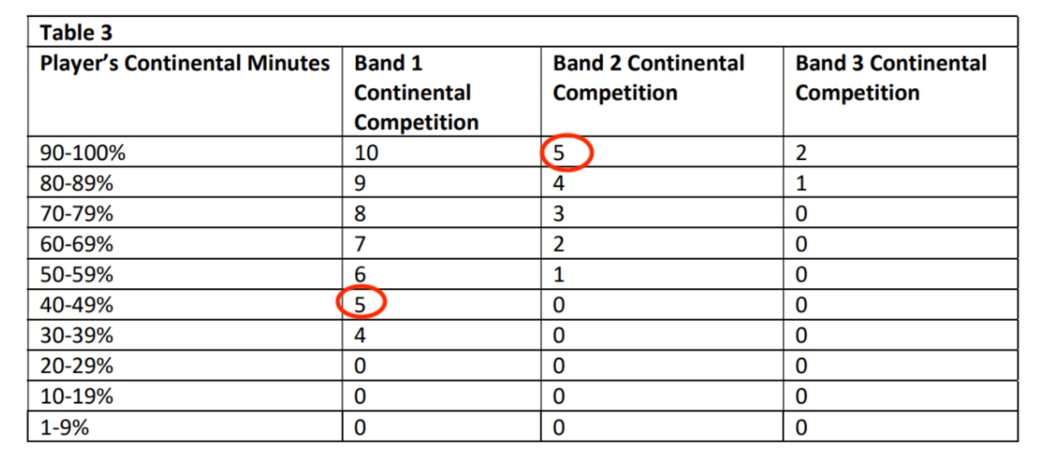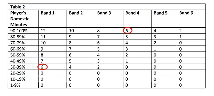 Как и в случае с международными матчами, если соревнование идет в верхней группе, игрок набирает больше очков за меньшее количество сыгранных минут. Например, игрок, играющий в Серии А (Band 1), наберет 6 очков, если он появится только в 30% игрового времени, но игрок из Колумбийской Примеры (Band 4), должен будет отыграть 90% минут для тех же 6 очков.
