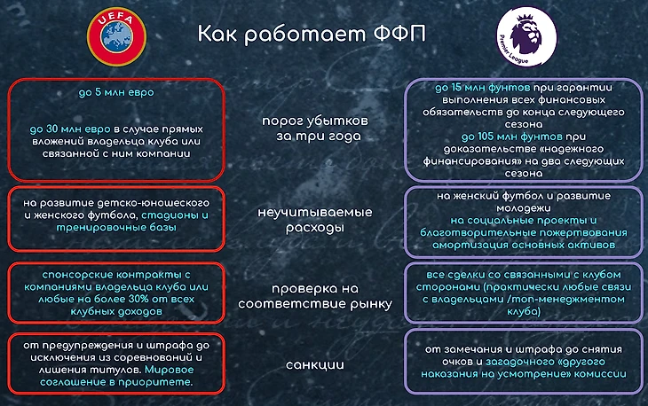С 2013-го внутренние финансовые правила заработали в АПЛ. Потенциальным участникам еврокубков из Англии по сути надо вписываться в оба фэйр-плей — без внутренней лицензии их просто не допускают в турниры УЕФА.