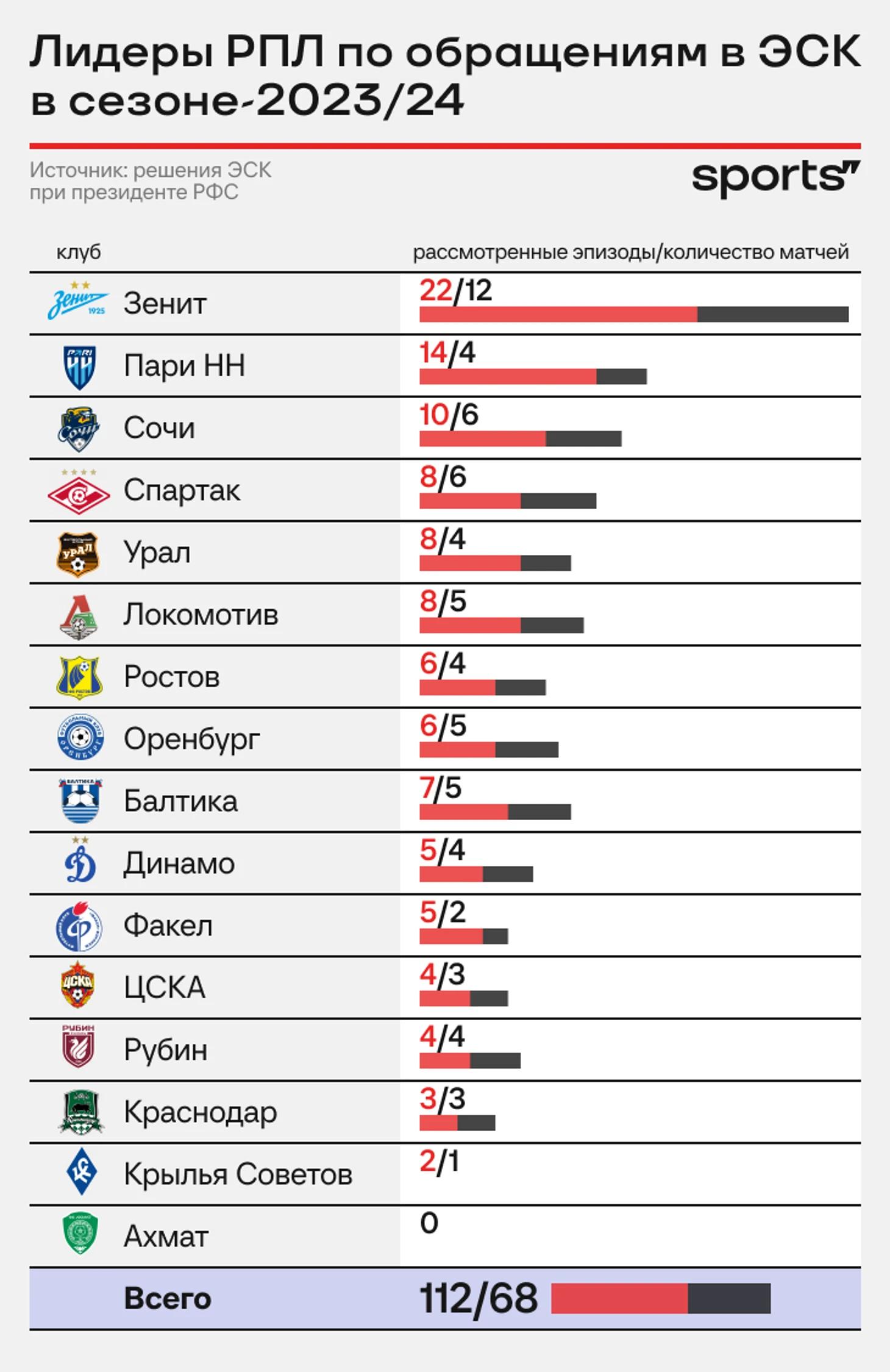 Количество ошибок может зависеть от количества жалоб, поэтому проверим, кто в сезоне-2023/24 чаще всего ходит в ЭСК.