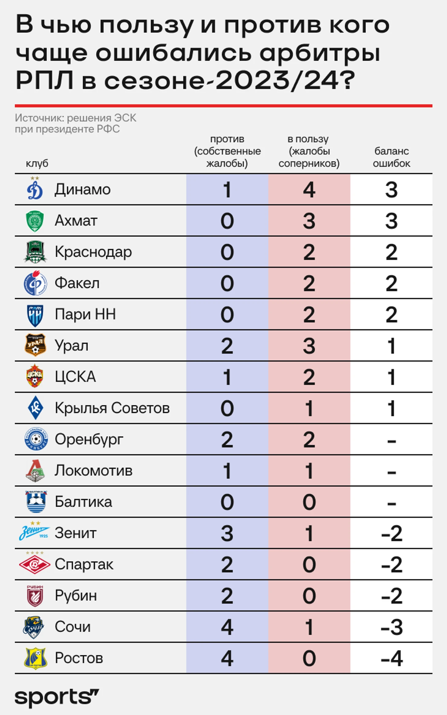 Кстати, как раз «Динамо» лидирует в сезоне по ошибкам в свою пользу – 4! Такого баланса нет ни у кого в лиге.