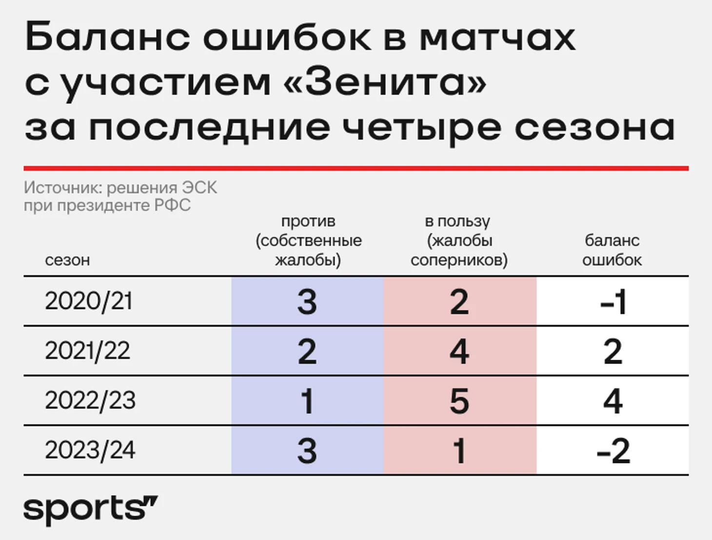 У «Зенита» положительный баланс, а по ошибкам клуб не выделяется ни в одну, ни в другую сторону. Какой-то особый судейский подход к клубу не зафиксирован.
