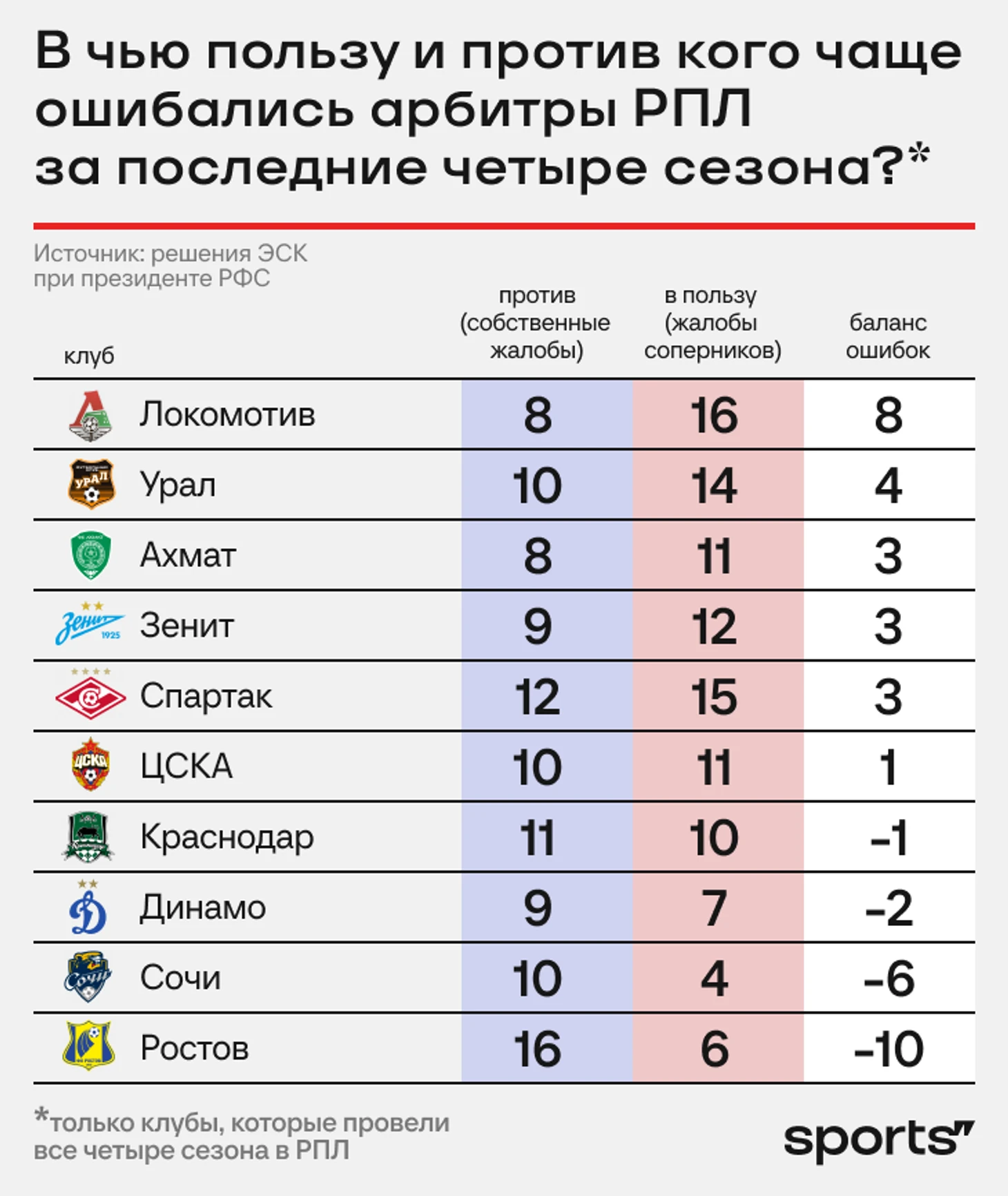 Кажется, больше всех должен возмущаться «Ростов» – четыре признанные ошибки против и ни одной в пользу. При этом его соперники подали 14 жалоб на судейство, но ни одна из них не была удовлетворена – то есть в пользу ростовчан не ошиблись ни разу.
