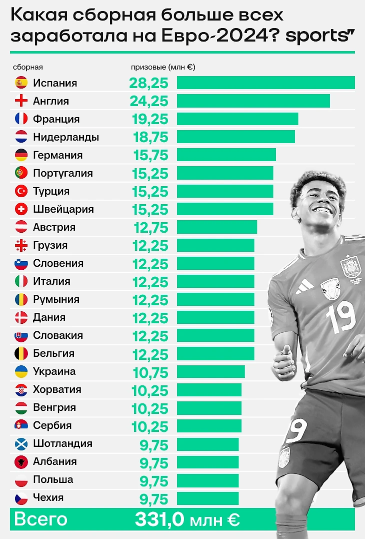 Команды разделили 331 млн евро, что больше половины всех расходов УЕФА на турнир (645,5 млн евро), но всего 12% от общих доходов Евро-2024 (2,4 млрд).