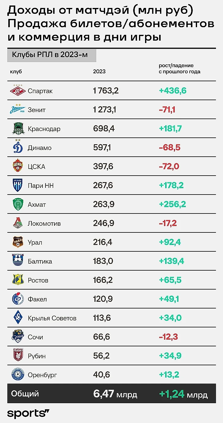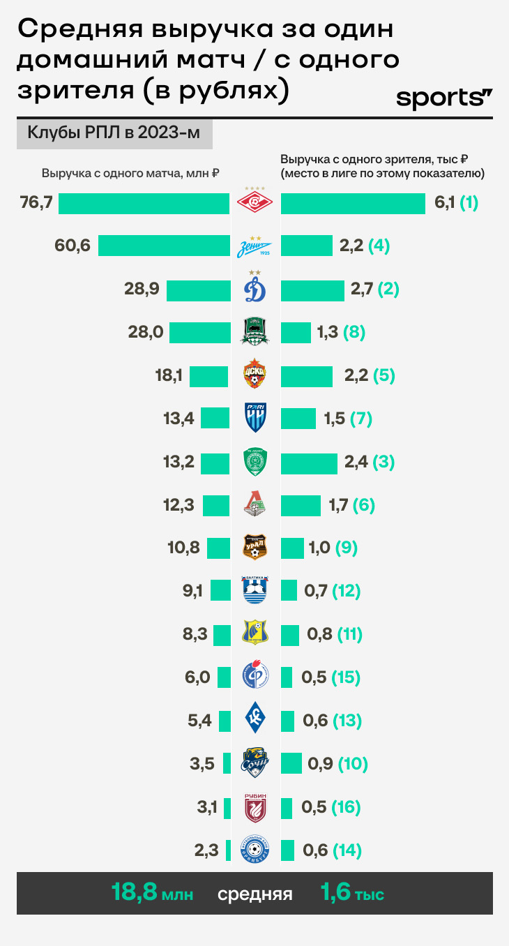 ● Рост матчдэй-выручки «Ахмата» (с 7,7 до 263,9 млн) и «Пари НН» (с 89,4 млн до 267,6 млн) – загадка. Грозненцы предпоследние по домашней посещаемости (4,9 тысяч), нижегородцы – 12-е (8 тысяч). У «Ахмата» какая-то фантастическая разница по среднему чеку зрителя – 65 рублей в 2022 году и 2,3 тысячи в 2023-м. Возможно, клубная бухгалтерия просто запутались в отчетности (сейчас или год назад). Так что эти показатели выводим за скобки.