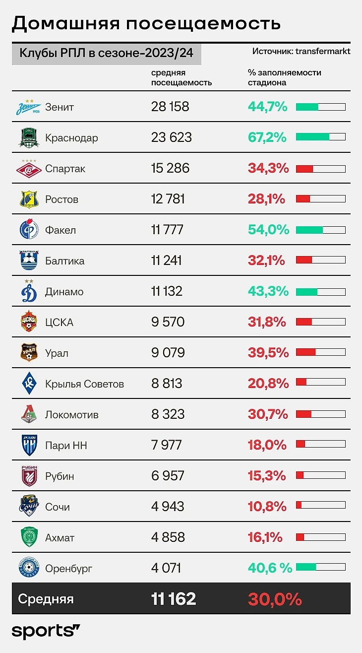 Средняя посещаемость в РПЛ выросла почти на 20 процентов, но это немного обманчивая статистика