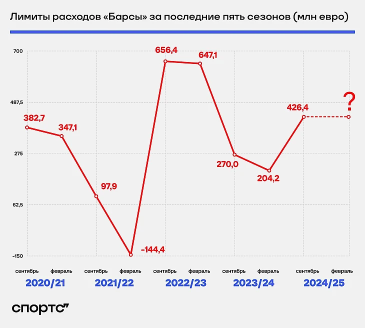 Проблемы «Барсы» начались в сезоне-2021/22 – лимит ушел в аномальные минус 144,4 млн евро. Поэтому летом 2022 года потребовались фокусы с бюджетом – так появился мем про рычаги Лапорты. Лимит расходов на состав из минусового скакнул в плюс 656,4 млн евро, но только временно. Основная причина колебаний: ежегодно рассчитывать на рычаги нельзя – они срабатывают только один раз (ну или надо выдумывать новые).