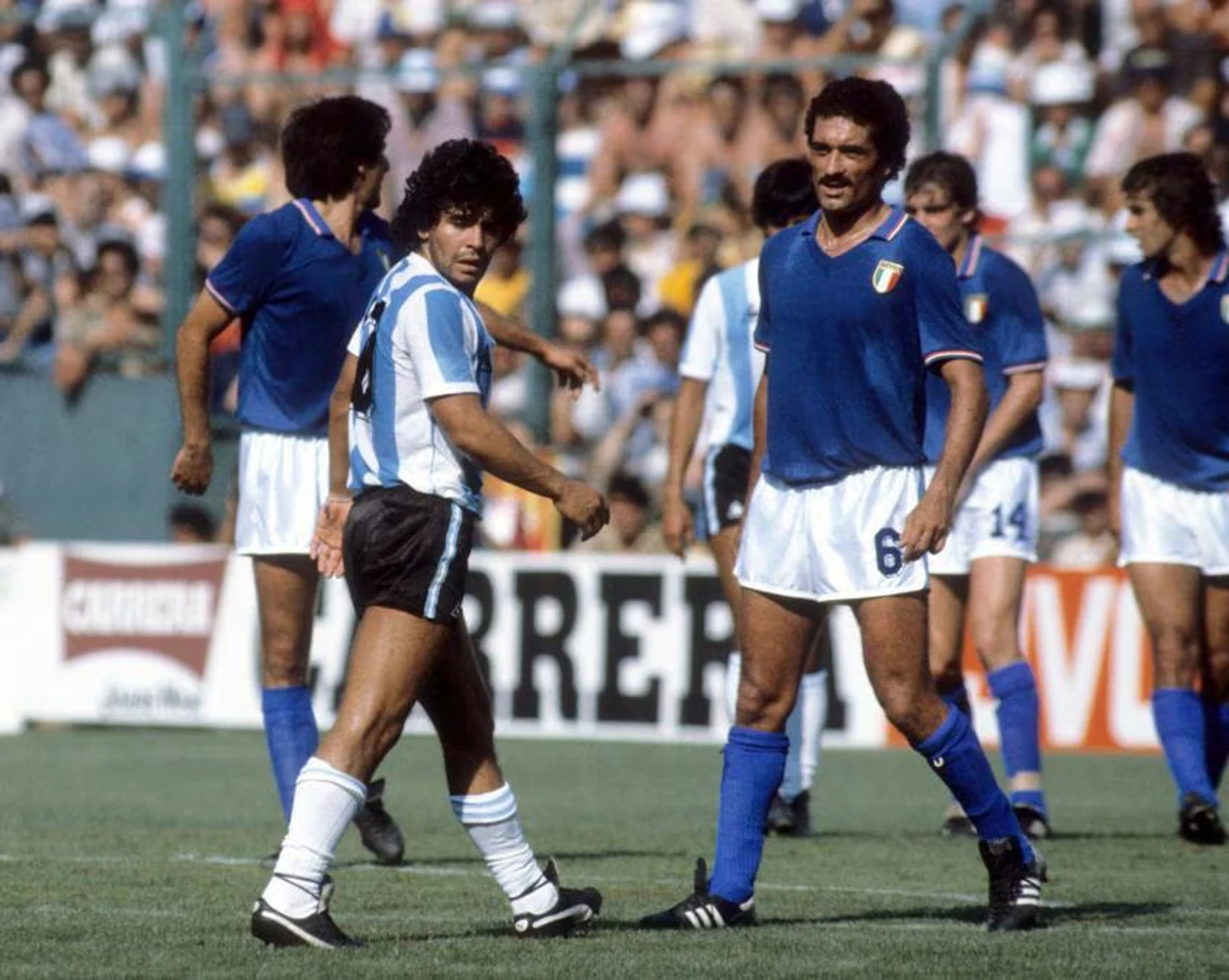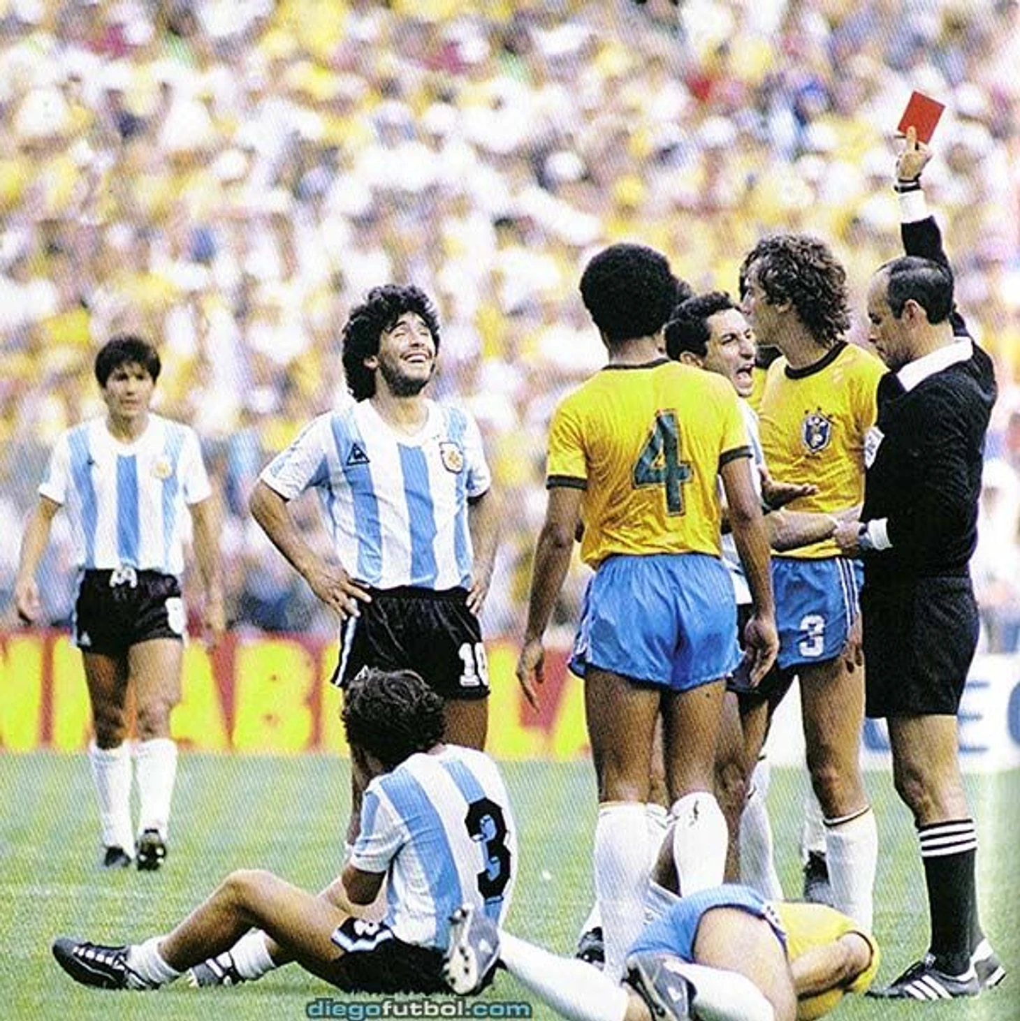 Для нас это лучшая возможность изучить вблизи наших следующих соперников, которые наносят смертельный удар действующим чемпионам мира. Марадона — именно он, который обвинял меня в чрезмерной жесткости и нечестности — теряет голову и удаляется за грубую игру, после того как ударил Батисту ногой в живот.