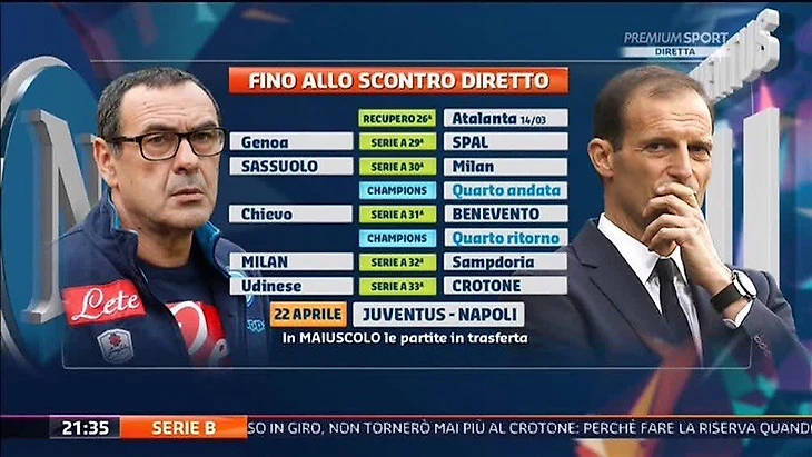 «Ювентус» будет сверхмотивирован в игре с «Аталантой». В случае победы отрыв от «Наполи» увеличится до четырех очков, а очное противостояние с "адзурри" 22 апреля будет иметь уже не столь определяющее значение в борьбе за титул. В условиях насыщенного графика, "зебры" могут больше внимания уделить походу на Киев в главном турнире старого света. Неаполитанцы же ради первого со времен Марадоны скудетто пожертвовали и Лигой Чемпионов, и национальным Кубком, и Лигой Европы. Сарри направил все силы на достижение 30-летней мечты Неаполя. Но с таким колоссом как «Юве» соперничать очень сложно. «Наполи» - не самый богатый и не самый сильный клуб в Италии, так что у нас нет обязательства выиграть Серию А. Давайте не забывать, именно благодаря «Наполи» в Италии еще живет интрига." - Маурицио Сарри признает, что битва изначально была неравной.