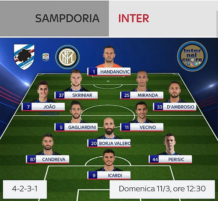 Ориентировочный состав «Интера» на матч против «Сампдории» от Sky Sport