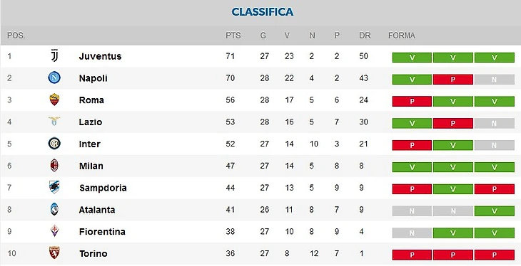 Верхняя половина турнирной таблицы Серии А после 28-ого тура
