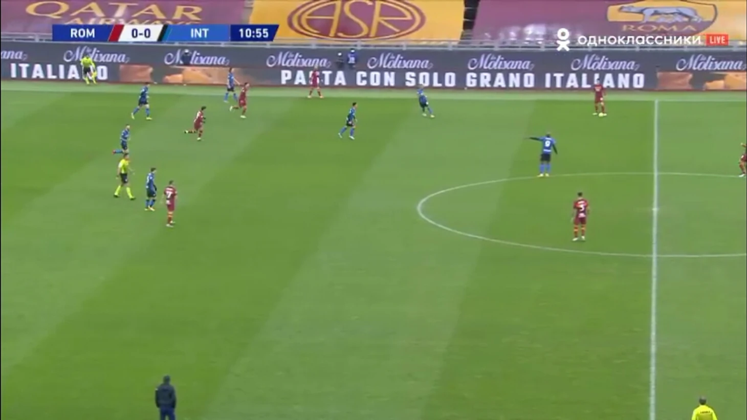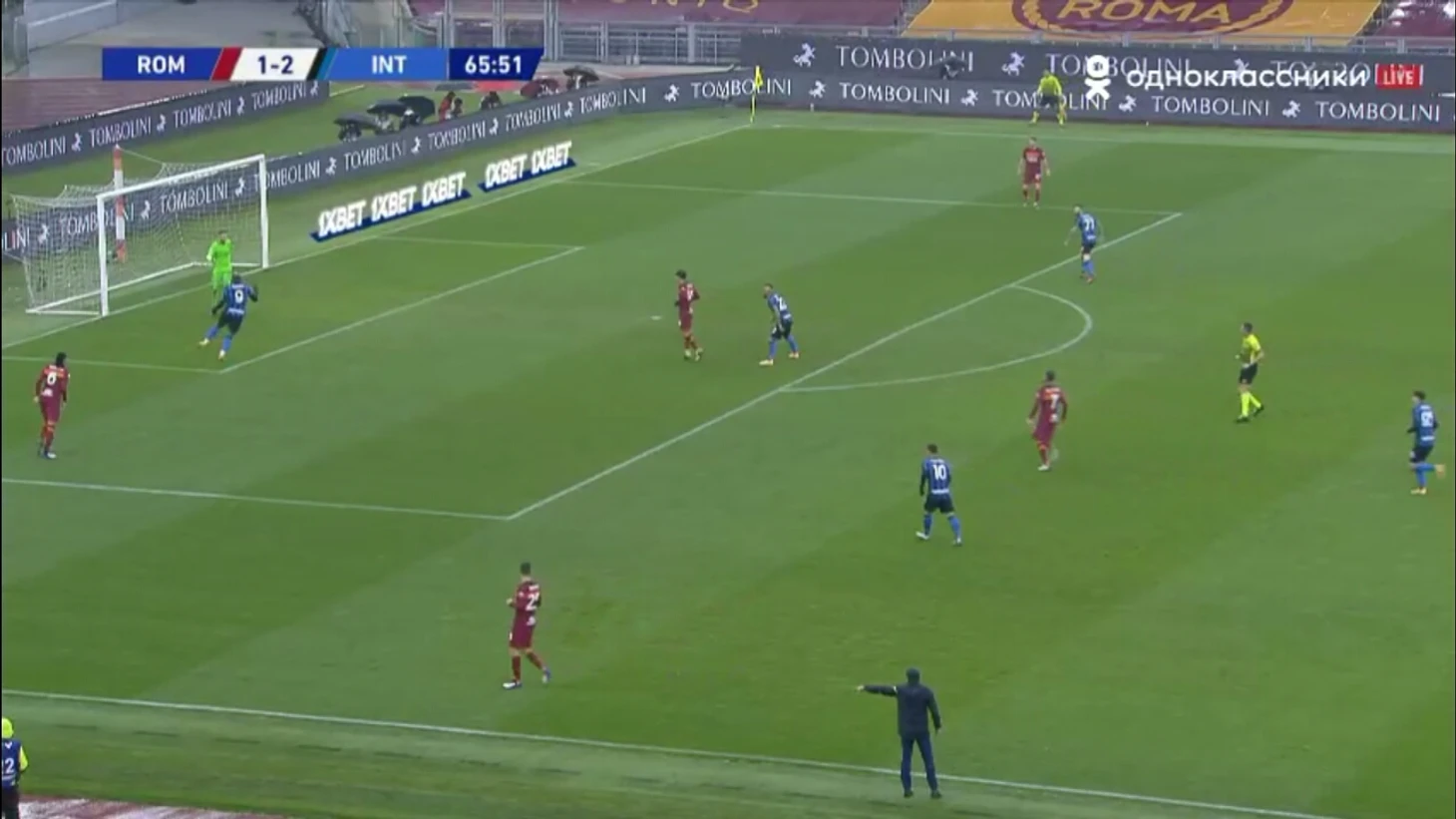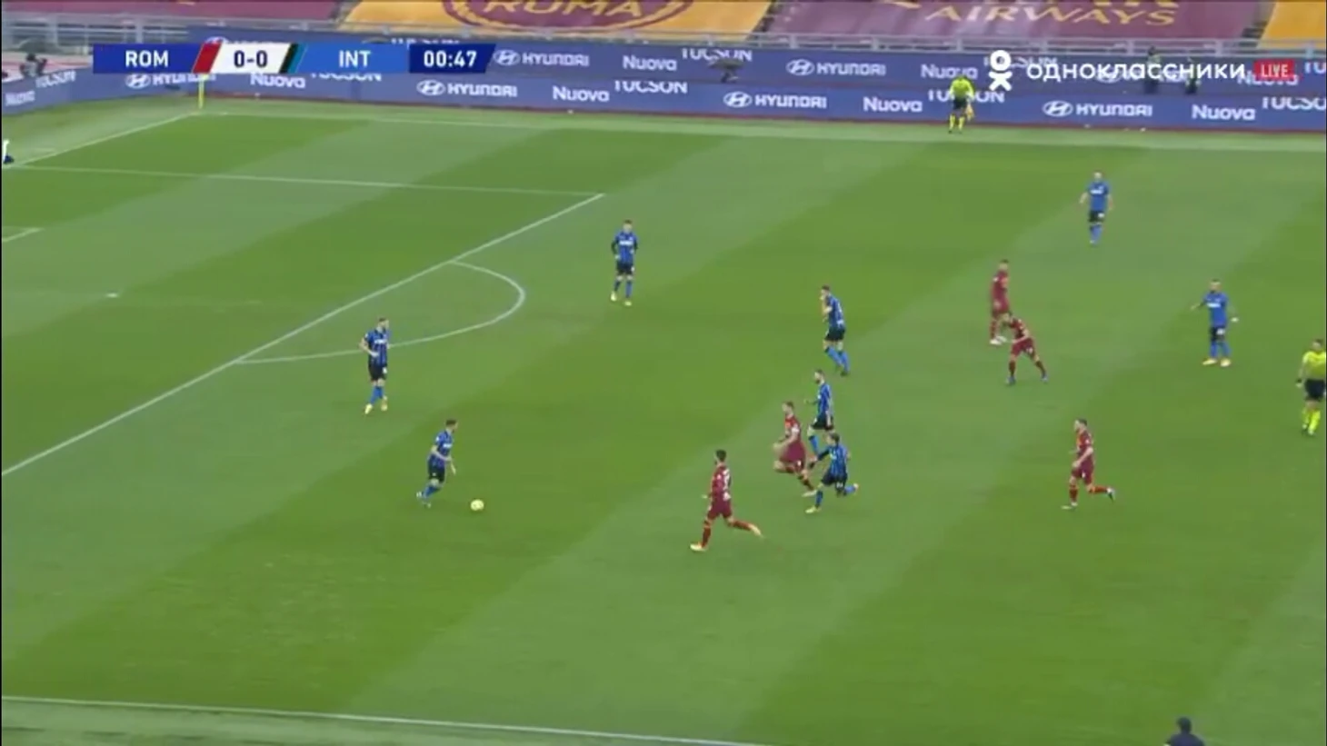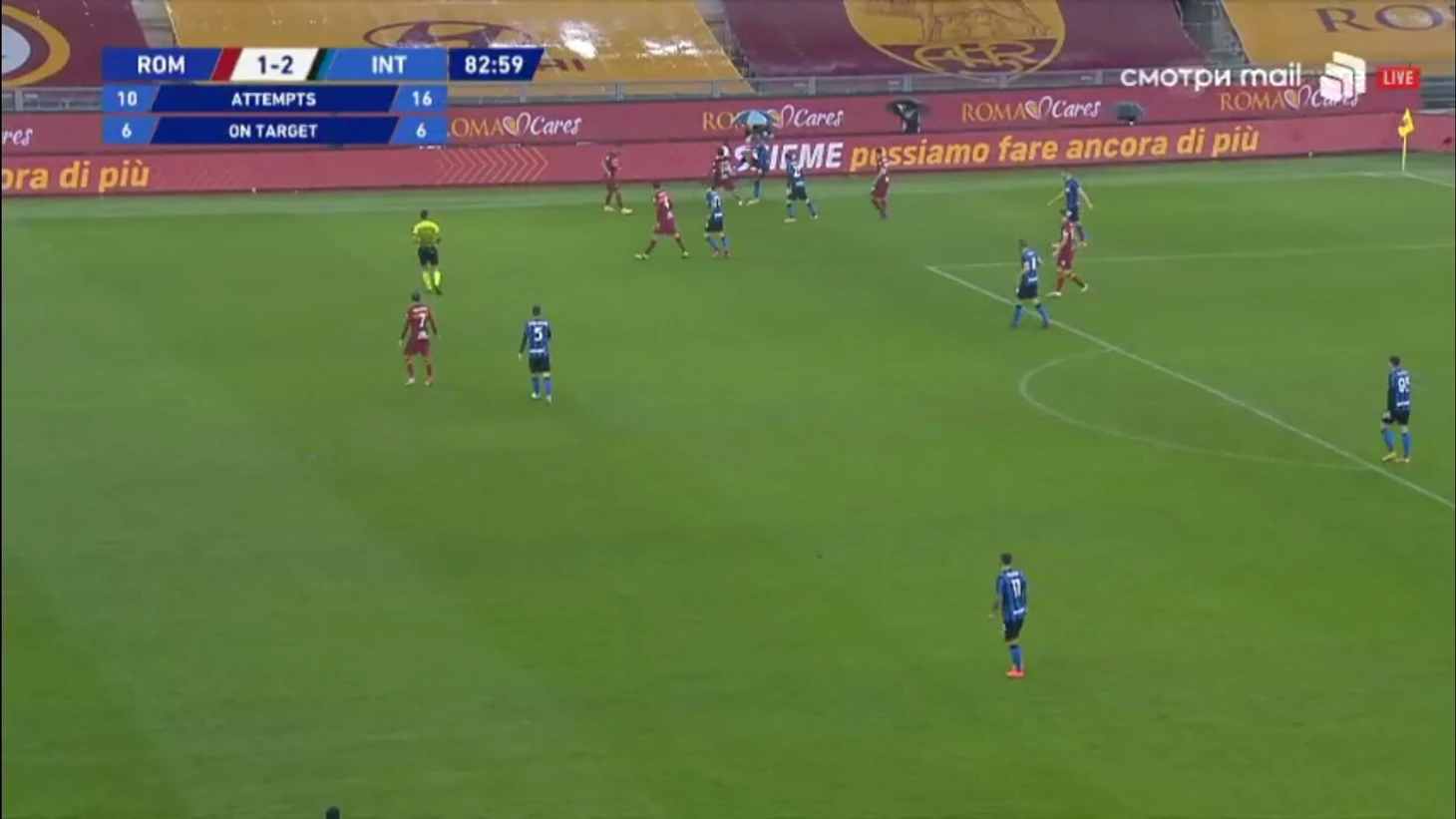 Интер выпустил на поле Перишича на место Лаутаро Мартинеса, семьдесят седьмая минута. После этой замены игра команды существенно изменилась : "Интер" отдал инициативу сопернику, очень низко сна в оборону, прессинга уже совершенно не наблюдалось, но он уже появился у мотивированных на гол римлян.