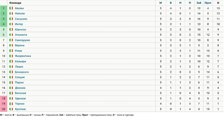 После 5-ти туров таблица Серии А выглядит следующим образом:
