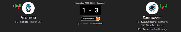 По ходу матча арбитр встречи, Джанпаоло Кальварезе, дважды обратился к системе VAR после обоих случаев были назначены 11-метровые удары, по одному в ворота обеих команд. Фабио Куальярелла упустил возможность сделать дубль, вратарь 'Аталанты" отразил его удар. А вот Дуван Сапата свой удар реализовал, однако это не помогло хозяевам поля свести матч к ничьей. В концовке встречи "Сампдория" забила еще один, счет на табло стал 1:3. "Аталанта" терпит второе поражение в Лиге подряд.