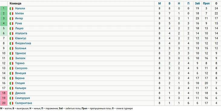 Пока же зафиксируем положение команд в чемпионате Италии: