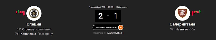 Гости открыли счет в первом тайме, отличился Симеон Нванкво, однако хозяева поля смогли не только сравнять счет, но и одержать волевую победу. Гол и голевая передача за «Специю» на счету Виктора Коваленко, который этим летом был арендован у «Аталанты».