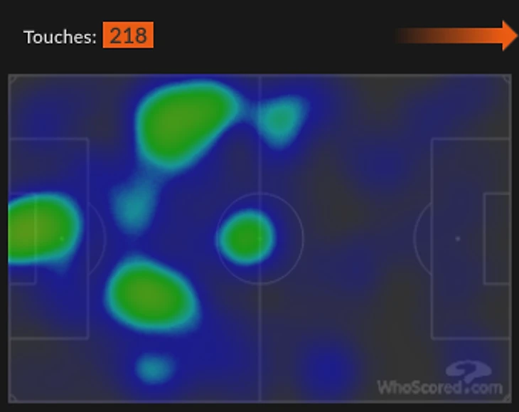 Бóльшую часть первого тайма «Рома» провела в обороне, ожидая возможности для контратаки: стартовая схема 4-2-3-1 при обороне трансформировалась в 4-4-2. Хозяева поля не нанесли ни одного удара в створ в первом тайме. Просто посмотрите на тепловую карту команды Моуриньо после первого тайма: