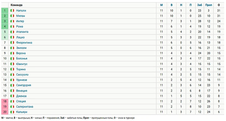 Зафиксируем положение дел в таблице Чемпионата Италии. Двоевластие «Милана» и «Наполи», «Ювентус» ближе к последнему место, чем к первому, высокие позиции «Фиорентины» и «Эмполи».