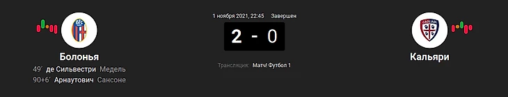 «Болонья» прервала серию из трех матчей без побед. В следующем туре подопечные Синиши Михайловича сыграют навыезде против «Сампдории». «Кальяри» терпит третье поражение подряд, команда располагается на последнем месте, имея в активе 6 очков.