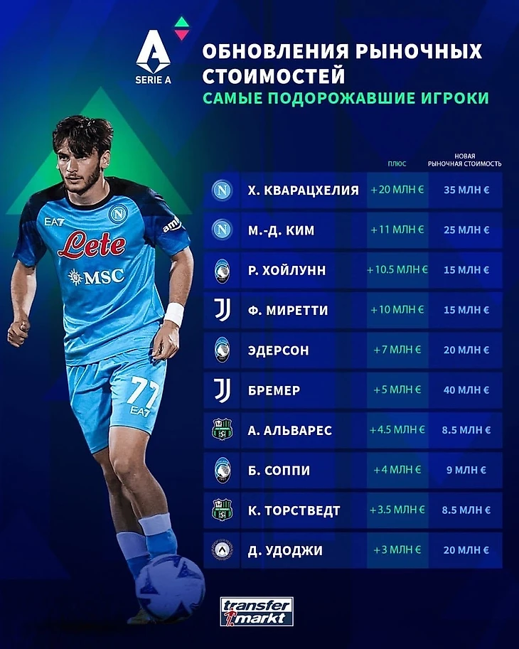 Хвича Кварацхелия возглавил рейтинг самых подорожавших игроков Серии А. На данный момент сайт Transfermarkt оценивает рыночную стоимость полузащитника в 35 млн. евро, увеличение цены составило целых 20 млн.