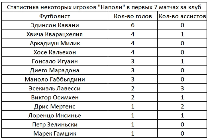 Стоит оговориться: это не список лучших дебютантов в истории клуба. Кроме того, конечно, стоит учитывать сыгранное время, дебют каждого игрока проходил по-разному: кто-то начинал сразу в старте, кого-то выпускали на замены…. Тем не менее, Кварацхелия дебютировал на по-настоящему высоком уровне, особенно на фоне того, что футболист переехал в Италию из довольно среднего Чемпионата России.