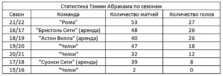 Сезон 21/22 Абрахам провел на очень высоком уровне: летом нападающий перебрался из «Челси» в «Рому», где сразу же стал важным элементом команды Жозе Моуринью. В своем первом сезоне в Серии А Тэмми забил 17 голов. Больше в дебютном сезоне в лиге за «Рому» забивал лишь Родольфо Волк – 21 мяч. Вот только было это аж 92 года назад! С таким показателем Абрахам стал лучшим бомбардиром команды и лидером «джалоросси» по системе гол+пас (21 очко).