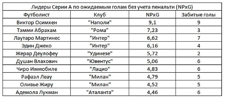 В чемпионате Италии Абрахам создает нереально много, англичанин – второй игрок по показателю NPxG (созданные моменты без учета пенальти), больше нападающего «Ромы» создает только Виктор Осимхен. Однако, количество «реально» забитых голов существенно разниться с тем, что показывают данные об ожидаемых голах.