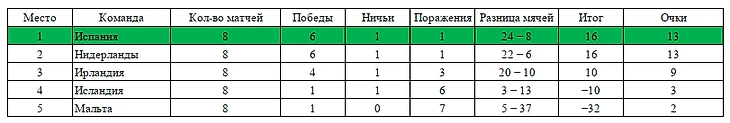 Финальный свисток зафиксировал уникальный по своей беспрецедентности результат – 12:1 в пользу сборной Испании. Итог, которого «красной фурии» хватило, чтобы занять первое место в группе и отобраться на Евро.