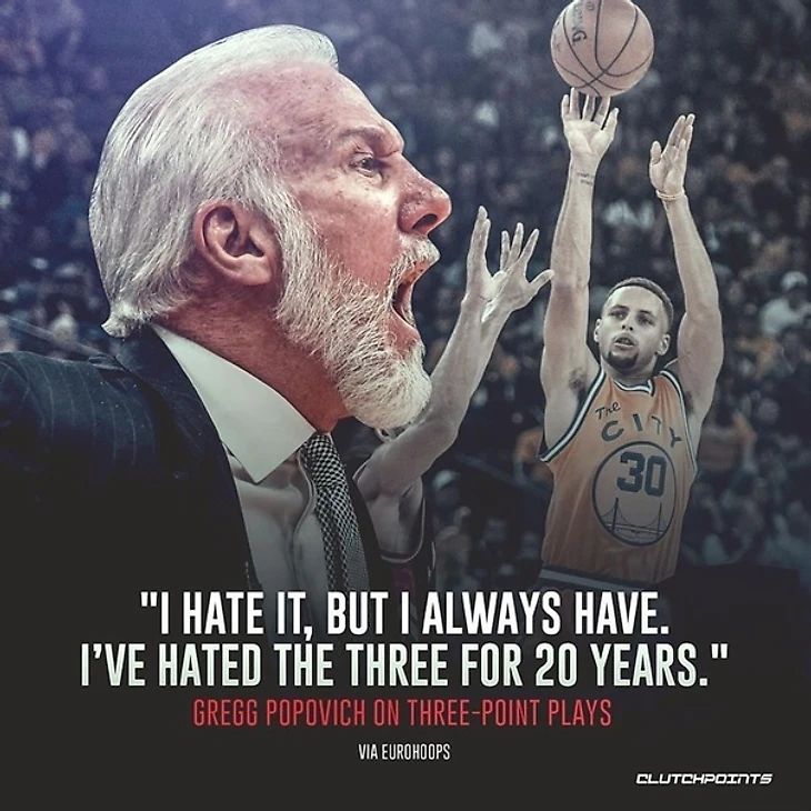 Но не каждый игрок, и тем более тренер готов следовать современной моде баскетбола. Самым ярым противником изменения игры в пользу дальних бросков является великий Грегг Попович, который несколько раз выражал свое недовольство в интервью, говоря о том, что он ненавидит трехочковый бросок, и делает это последние 20 лет.