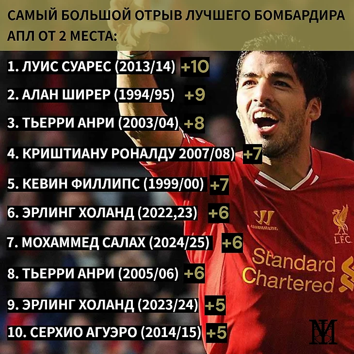 Как видим, первое место в этом списке за Луисом Суаресом, который в 2013 и 2014 годах наколотил 31 мяч за Ливерпуль, обогнав тем самым ближайшего преследователя, и по совместительству коллегу по клубу, Даниэля Старриджа, на 10 голов. Также здесь можно найти прошлогоднего чемпиона Англии Мохаммеда Салаха, который обогнал Александра Исака на 6, а Эрлинга Холанда на 7 мячей. Сам норвежец в этом списке встречается дважды, в 2023 и 2024 годах он становился топ-1 бомбардиром, обогнав топ-2 на 6 и 5 голов соответственно.