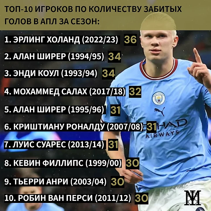Следующий рекорд уже принадлежит Эрлингу, но почему бы не побить его вновь. Это топ-10 по количеству голов за один сезон Премьер-лиги: