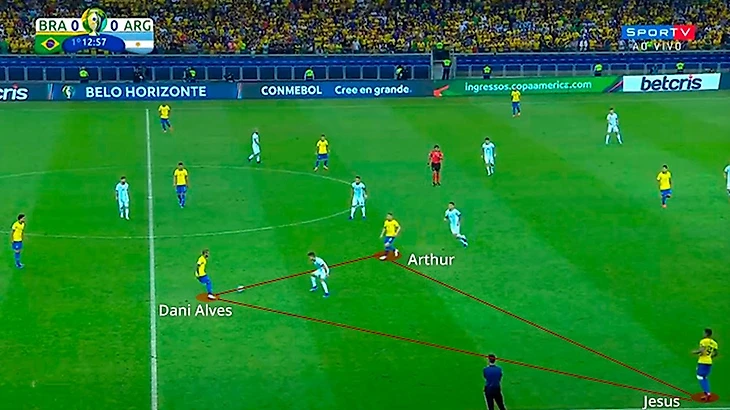 Матч начался довольно резво,с обилием фолов (ну а чего вы хотели от Суперклассико в полуфинале?). Причем грешили этим по большей части игроки Альбиселесте,просто не успевавшие за бразильцами, хранившими где-то до 30-ой минуты гроссмейстерское спокойствие во владении мячом-60/40. Конечно матч мог пойти совсем по другому сценарию, попади шальной выстрел Паредеса в правую "девятку" ворот Алиссона,но не случилось. Зато случился быстрый гол. Хорошо проведший матч Дани Алвес разбросал соперников,отдал Фирмино на фланг, и его прострел на одиноко стоящего в центре вратарской Жезуса стал результативным.