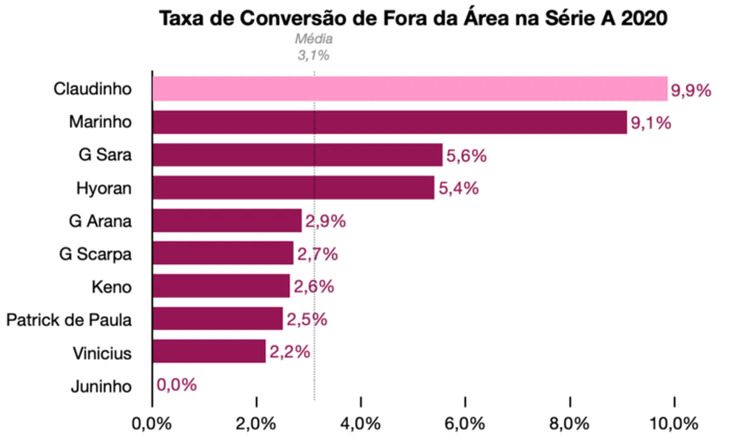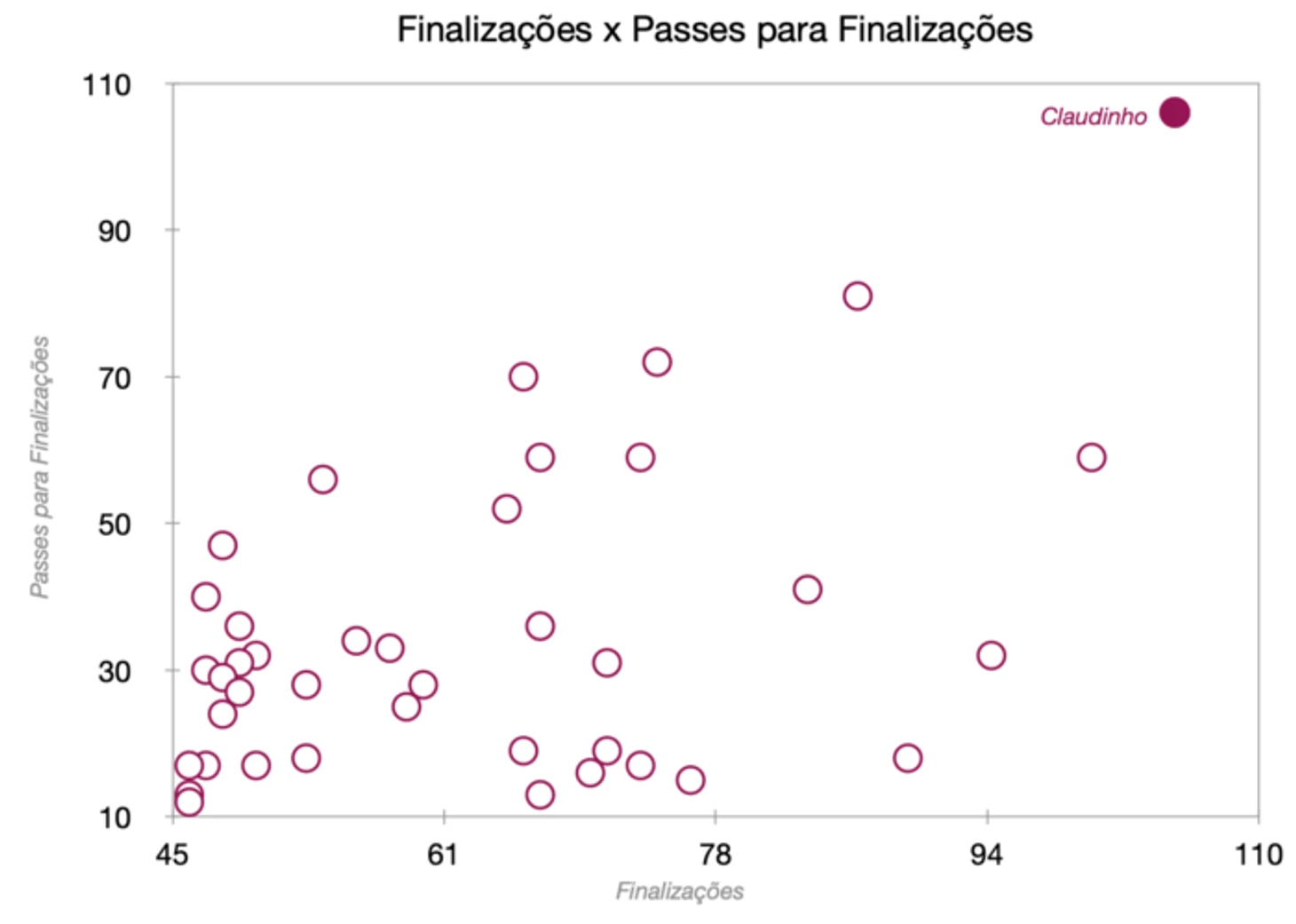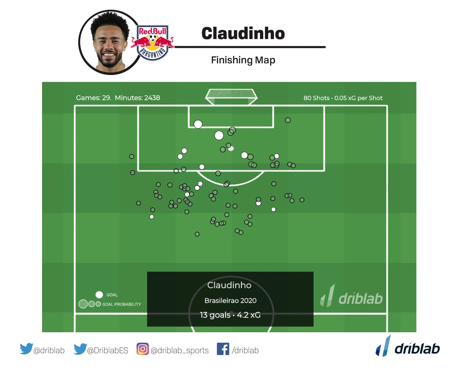 Вспомнить примеры, когда он откровенно губит атаки ударом вместо передачи мне сложно: Клаудиньо – совершенно не жадный игрок. Но все-таки над точностью ударов ему стоит поработать для успеха в Европе. И это несмотря на то,что Клаудиньо лучший бомбардир Бразилейрао с 18 мячами, а по соотношению xG он впереди всех героев Бразилии нынешнего года
