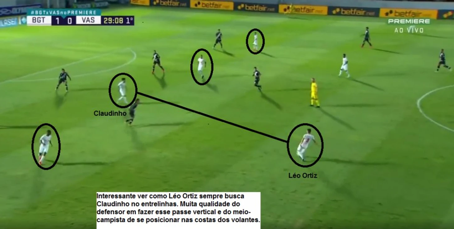 Это стихия Клаудиньо: он быстро ориентируется в подобных ситуациях, потому что ещё до приёма мяча знает, что будет делать дальше. Как в случае с голасо "Фламенго"-он показывает рукой загейро куда будет открываться под передачу, обыгрывается с партнером и выходит на оперативный простор.