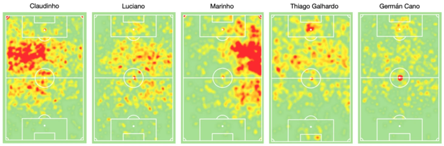 Для сравнения тепловые карты лучших бомбардиров Бразилейрао-Мариньо, Кано, Гальярдо и Лусиано.