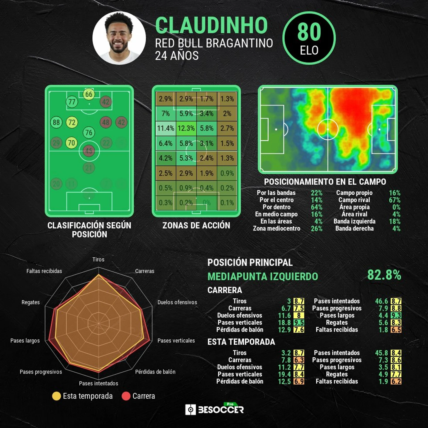 Физически и технически Клаудиньо создан для позиций десятки, инсайда или вингера, то есть может занять любую позицию под нападающим. Ему не принципиально, где располагаться, хотя комфортнее он чувствует себя в левой части поля или в центре; для команды он будет приносить максимальную пользу тогда, когда он будет максимально вовлечен в игру в атаке.