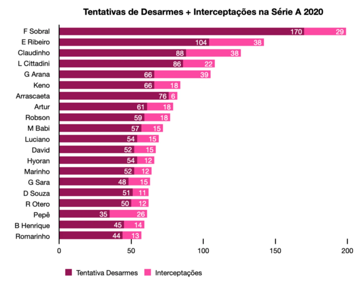 В целом Клаудиньо набирает за матч 2,1 оборонительных действий (отбор+перехват). Но давайте не будем забывать тот факт,что мейя "Брагантино" очень слаженно работает в "треугольниках"-а здесь не всегда вступая в контакт,ты можешь просто своим умным движением вынудить соперника ошибиться. Ведь и теоретически слаженная работа в треугольниках позволяет не "упахиваться".
