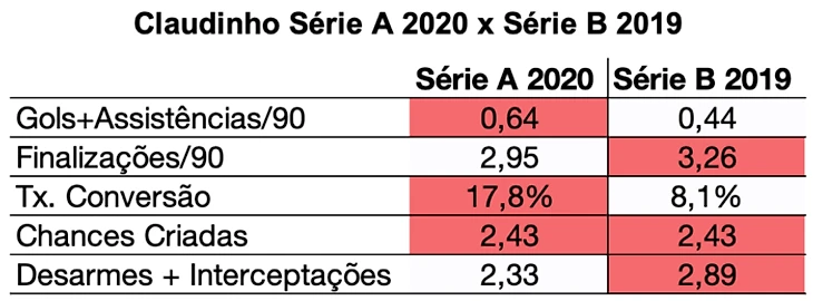 «Он хорошо проявил себя тогда, имел потенциал роста, который подтвердился в отличном сезоне, который он отыграл за «Брагантино» (в 2019 году). Я верю, что из него получится хороший игрок для Бразилейрао. Когда он прибыл к нам, Клаудиньо был легким худеньким парнем, но при этом хорошо проявлял себя в единоборствах один в один, многое добавлял в игру. Он хороший и думающий мальчик»