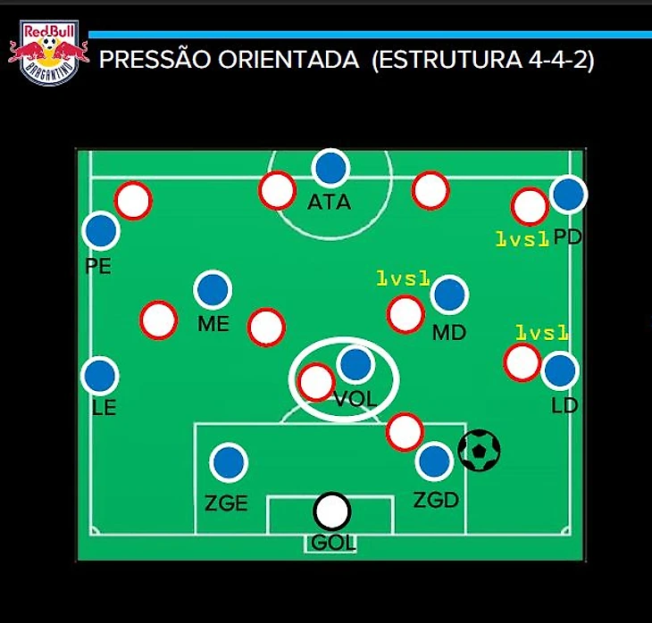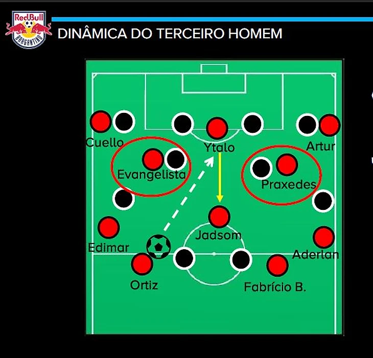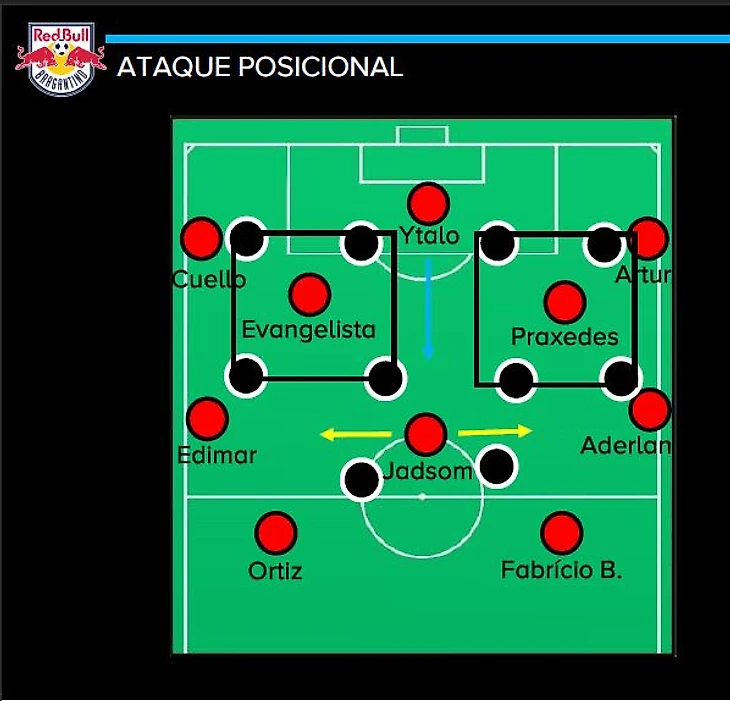 Атака Red Bull "Брагантино" характеризуется построением тщательно продуманных комбинаций. Она всегда подразумевает использование большого количества игроков, находящихся в непосредственной близости к мячу, с постоянным поиском свободных пространств и сменой мест. Образуя так называемые треугольники