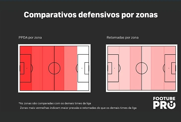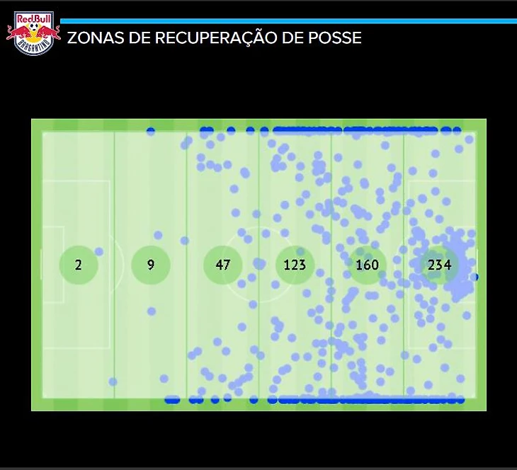 Обратите внимание где преимущественно стараются отобрать мяч игроки Брагантино в течение 7 секунд после потери. И это не фигура речи. Маурисио отрабатывает именно отбор на чужой половине поля с временным лимитом в 7 секунд на тренировках.