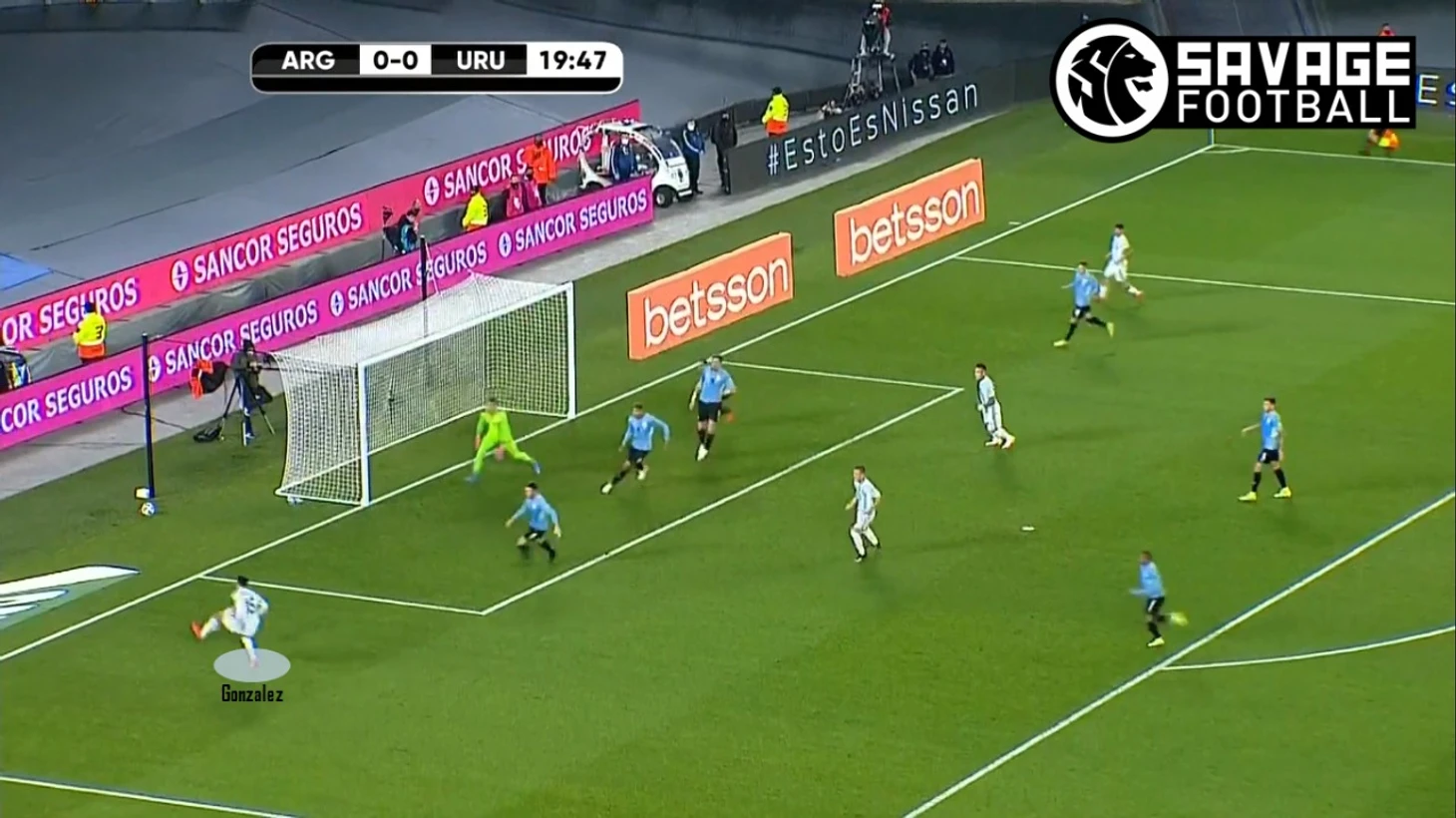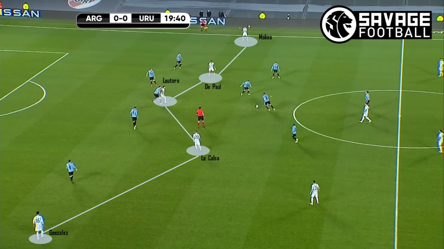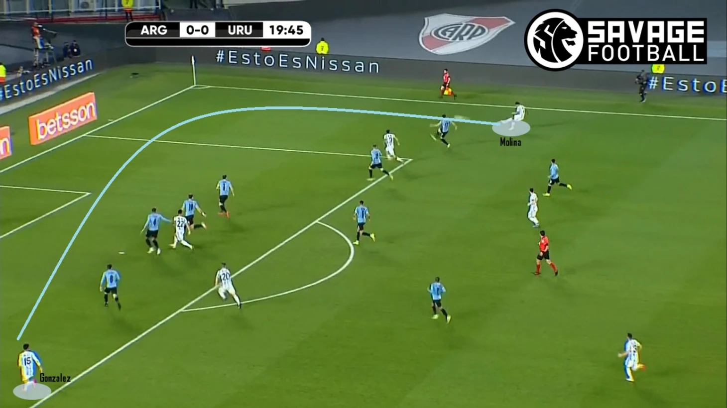 Второе- за счет создания ширины на флангах. У владеющего мячом, будь он Месси или Молина в любой точке был открывающий в свободную зону адресат.