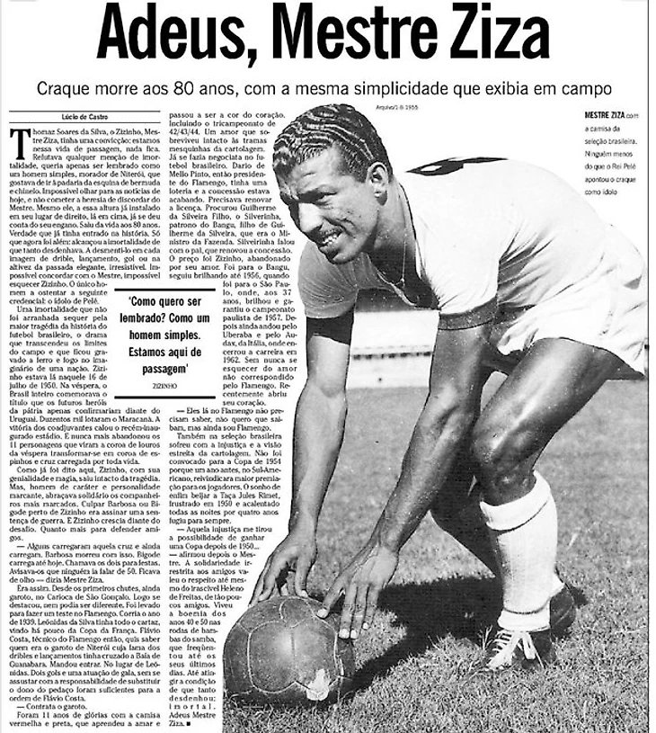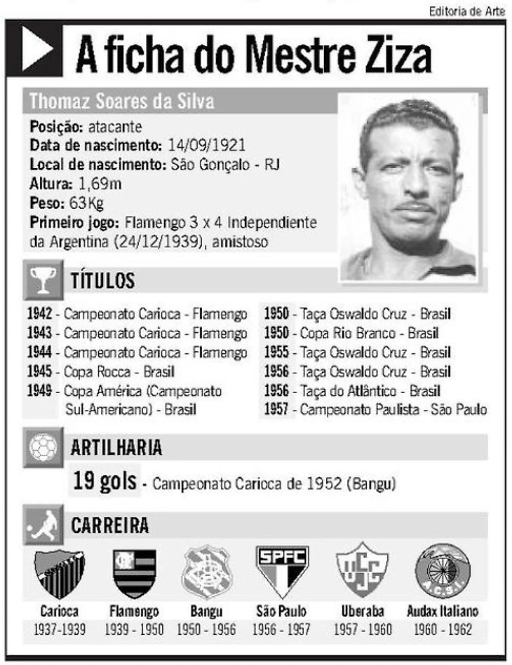 “Местре Зиза”, как его величали, считался на родине “Королём футбола” до появления Пеле. Это был игрок с оригинальным дриблингом, сильным, точным ударом, неповторимой техникой. Мяч был для него почти живым существом. “У него есть своя личная жизнь. Мяч любит, когда с ним обращаются нежно”.Зизиньо, по паспорту Томаз Соарес да Силва, родился в городке Сан-Гонсало. Его отец с несколькими своими друзьями из квартала Пайва организовали футбольный клуб « Кариока», выбрав для футболок красно-черные цвета (скопировав форму «Милана»), а для трусов - голубой (цвет флага штата Рио).
