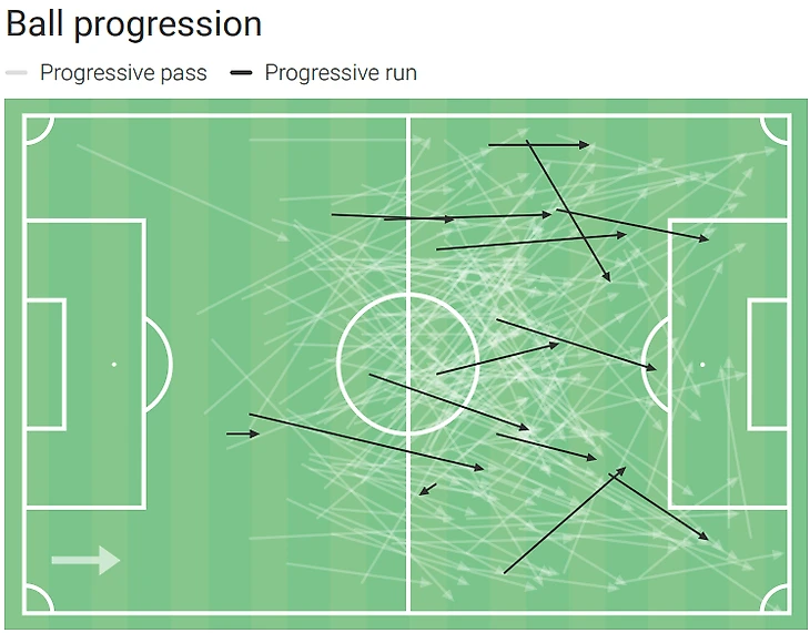 График ниже иллюстрирует разнообразие его передач. Четыре зоны ниже — его наиболее частые пасы. Лучи внутри них подчеркивают направление, скорость выполнения и длину его пасов. Обратные и фланговые передачи, как правило, намного короче и с высокой степенью завершенности. Это ключ к сохранению владения и перемещению мяча. .