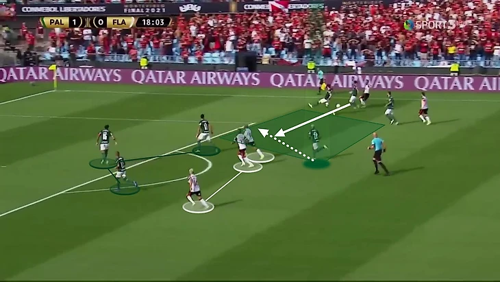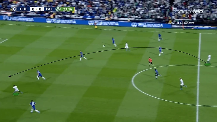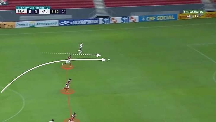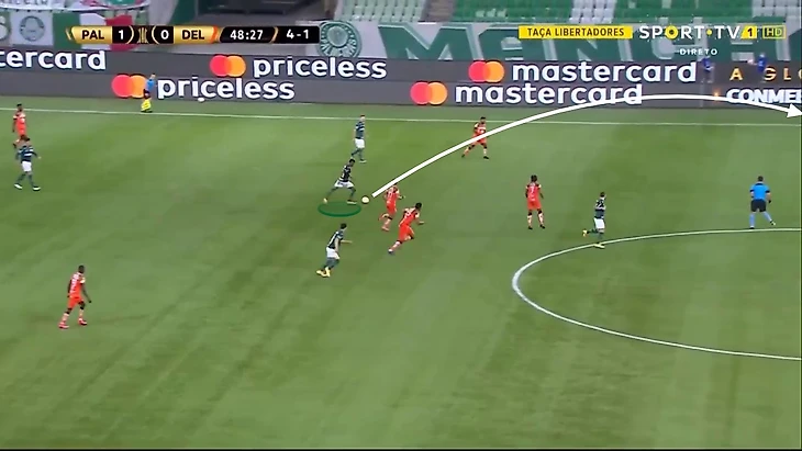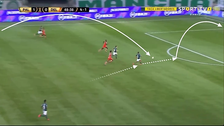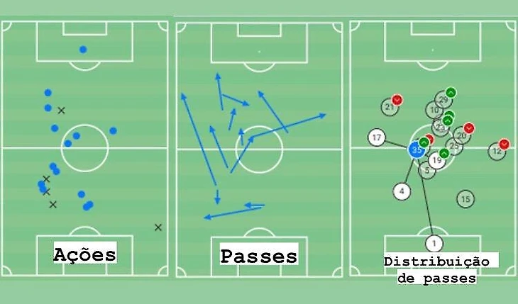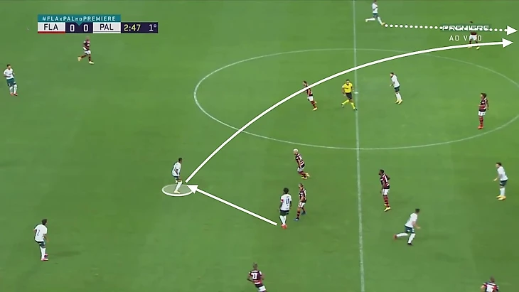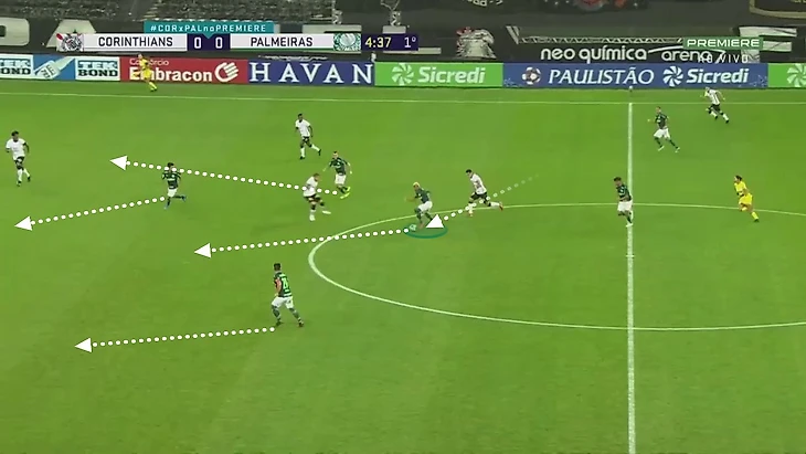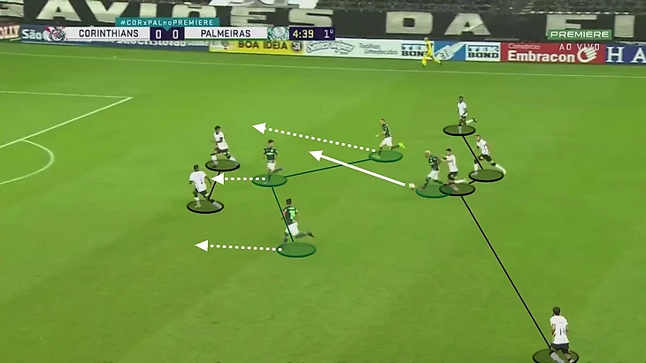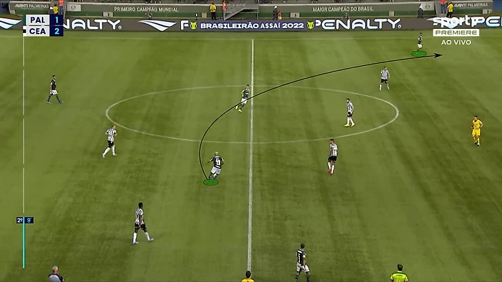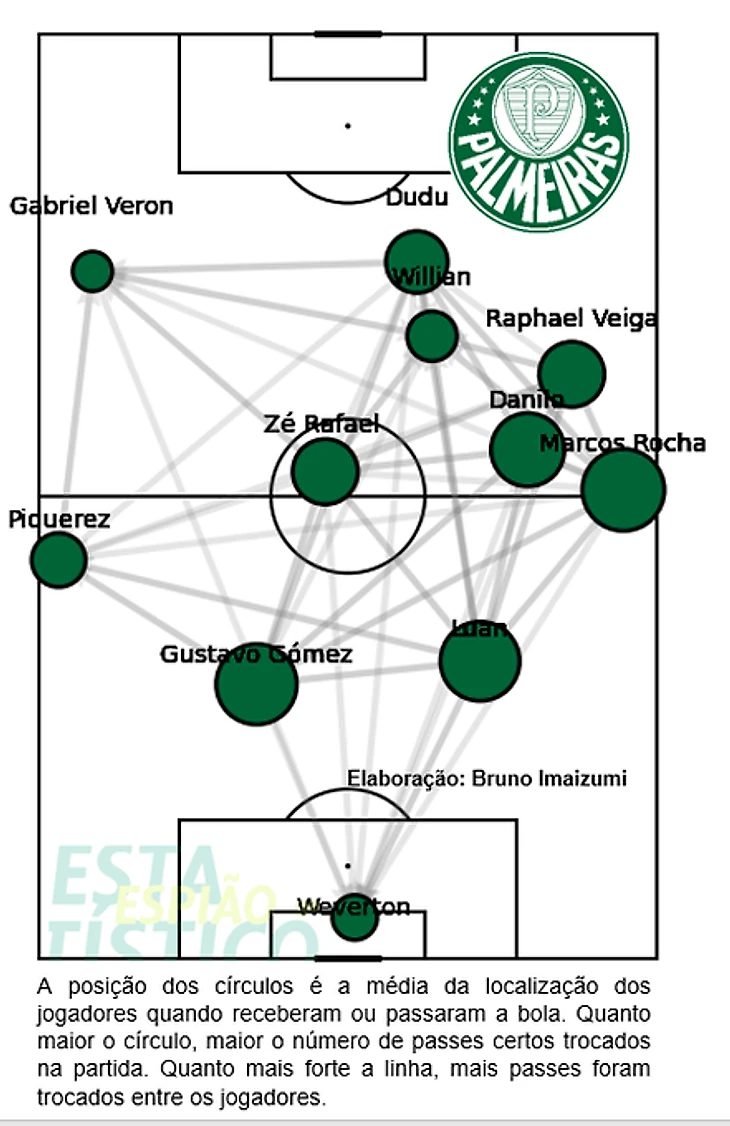 Кроме того, более длинные лучи представляют собой переводы игры с правой фланга на левый.  Это одна из стилистических особенностей- "Палмейрас" любит стянуть игроков противника на одну сторону и потом быстрым резким переводом атаковать противоположный фланг.