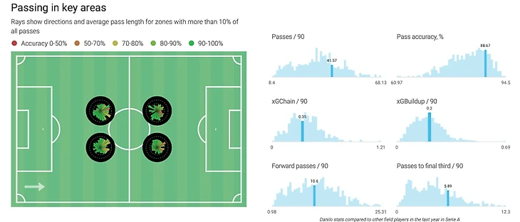 Так что Данило великолепно продвигает мяч вперед не только фирменным длинным пасом с точностью 64%.
