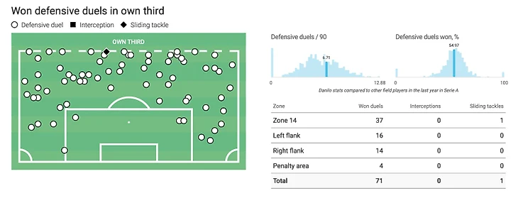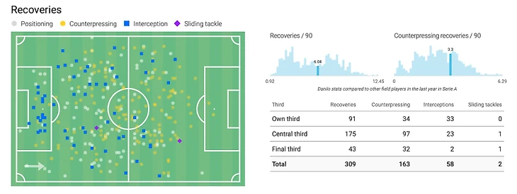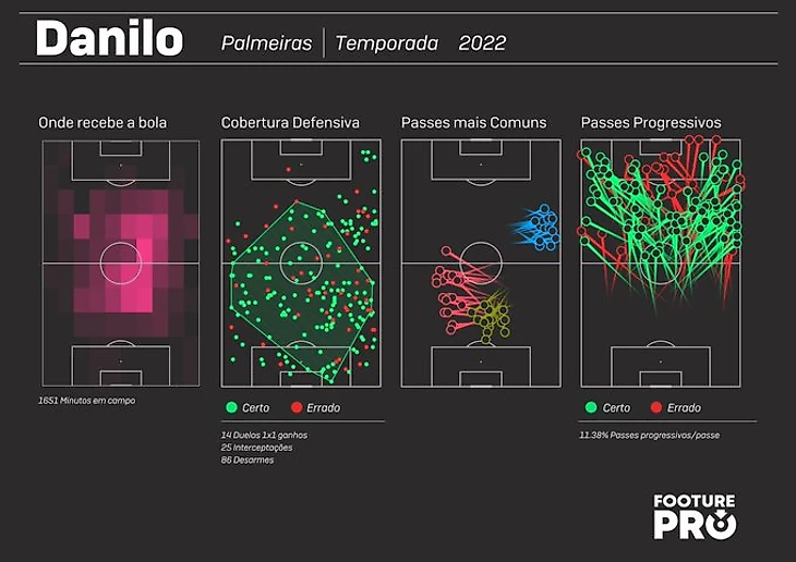 В почти образцовом матче против «Коринтианс» в Паулисте-2022 Данило смог свести на нет креативность большой умницы бразильского футбола Ренато Аугусто. Он может спокойно сыграть персонально и как правило выключает соперника из игры. Другим ярким примером как уже говорил служит финал Либера-2021, когда Арраскаэта просто не знал где и как ему получать мяч. На карте ниже показаны его восстановления на пространстве всего поля. Данило буквально везде.