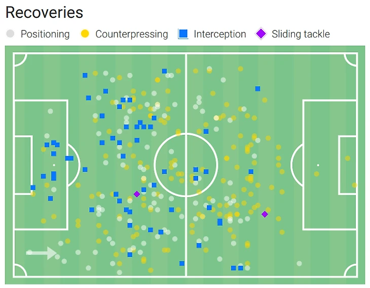 Упор он делает не столько на отбор, сколько на предугадывание развития атаки, в среднем делая 4,25 перехвата и 6,71 подбора за 90 минут.