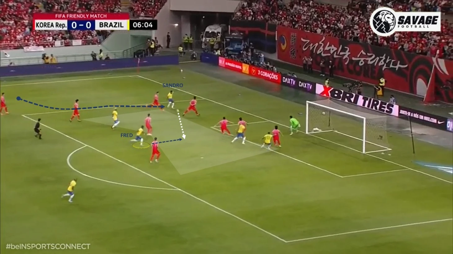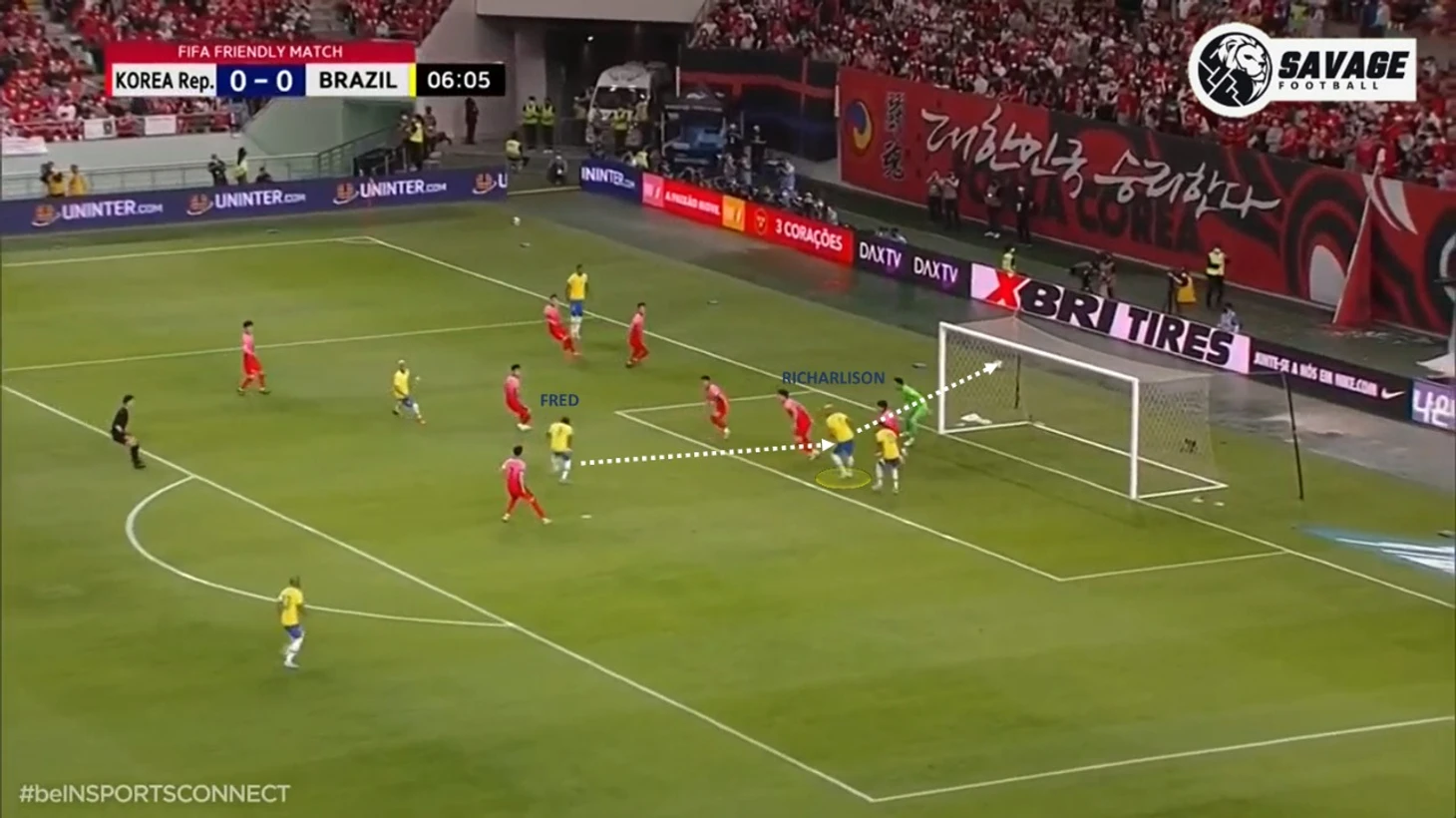 А на 7-ой минуте Бразилия забила первый, причем по всем правилам. Треугольник Ней-Пакета-Сандро и латераль "Ювентуса" вошел в штрафную, по науке отдал на набегающего Фреда, удар последнего может бы и зашел в угол, но Ришарлисон решил посодействовать. 4 гола в 3 последних матчах за сборную в исполнении Помбо и похоже нас ждет пара нападения на Мундиале аккурат идентичная олимпийскому турниру прошлого года.