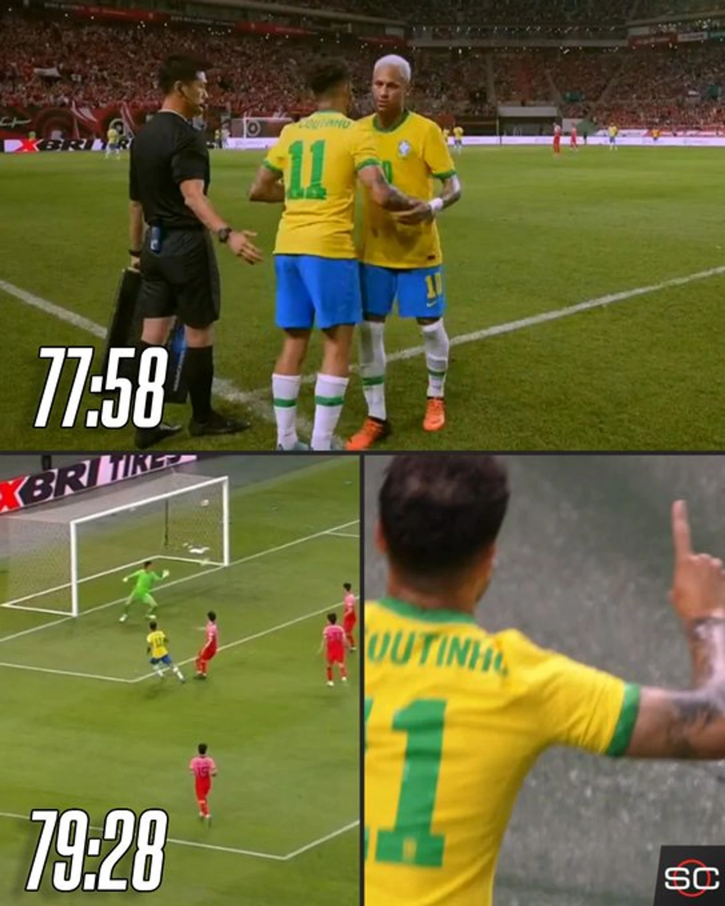 На этом все стало ясно уже и для корейцев. Тите как всегда подумал 10 минут и выпустил свежих Фабиньо с Винисиусом. Потом еще 10 и дал торсиде тех,кого она изначально ждала в старте-Гимараэса и Коутиньо. Филиппе наверное и размяться не успел как уже забил в дальнюю девятку. И я думаю дал всем понять что в клубе он можетиграть как угодно но место в сборной он никому не отдаст, даже Вейге. Который накануне в дерби с Сантосом прервал свою длиннющую серию из забитых подряд пенальти, на помощь Жоао Пауло пришла штанга.