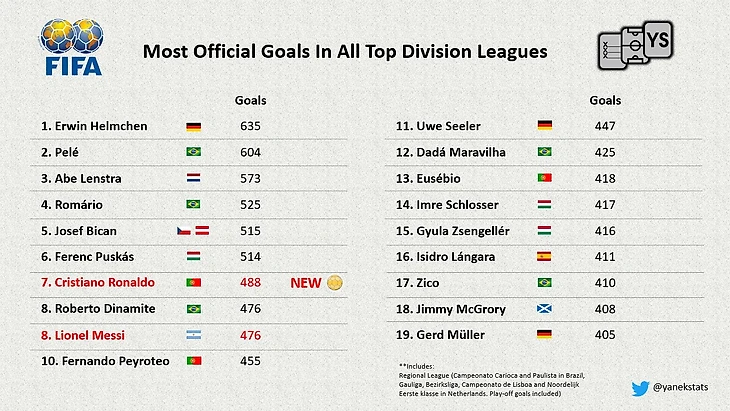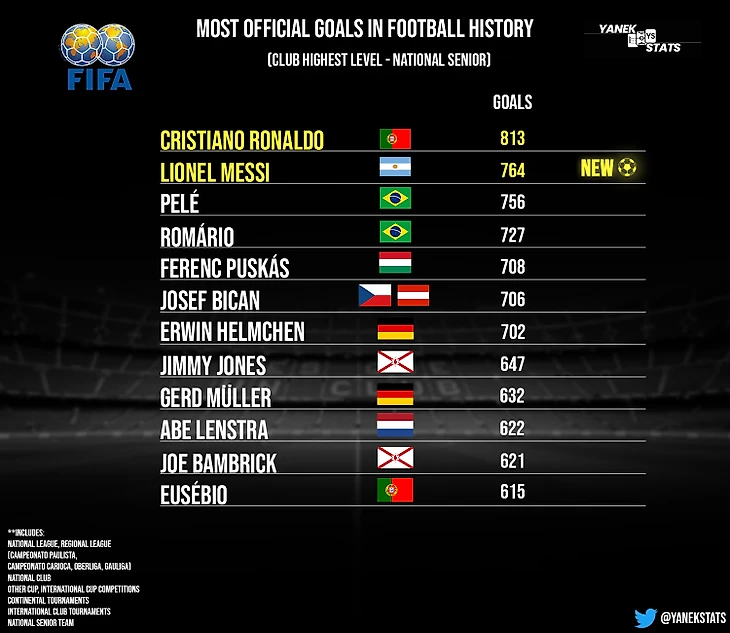 Конечно на днях пролетела новость,что Месси стал первым кому покорилась эта отметка. Но это по оценке Опты, а она считает клубные турниры только с 2003 года (национальные чемпионаты с 2005). В реальности же Лионель лишь повторил двух своих великих предшественников, заметно уступая им в эффективности, сыграв на 150+ и 300+ матчей больше Пеле и Пушкаша соответственно. Хотя, если кому-то хочется поставить Месси на первое место, то только с формулировкой в XXI веке.