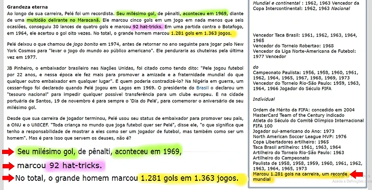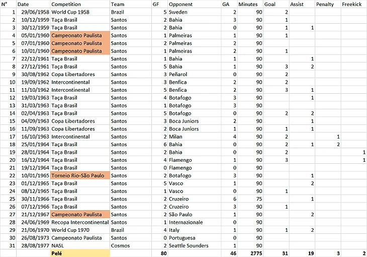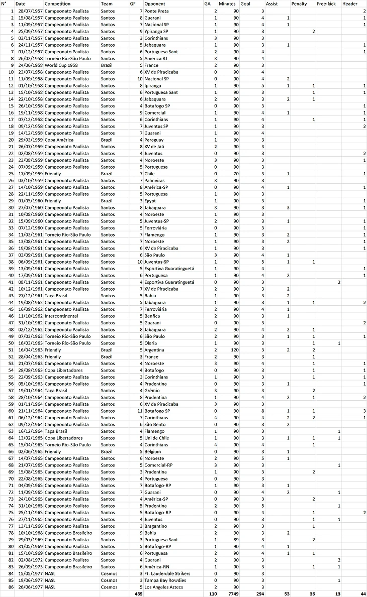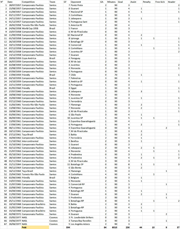 Именно здесь найдены и посчитаны все голевые действия бразильцев, довольно подробно скажу я вам. И полный архив данных по Пеле я неоднократно давал и сегодня обновляю. Там дата, соперник, счет, гол, голевая,штрафной или пенальти, голы головой отдельным столбцом. И напротив каждого матча ссылка на отчет в бразильском архиве. Открываешь и читаешь, если владеешь португальским. Только скажите честно-многие ли из вас даже скачали файл, не говоря уже о 800+ссылках? А их всего под 3000.